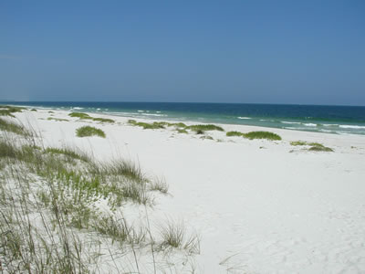 But for the rest of today . . . it's to the beach! One of the nice things about Big Lagoon is that it is at the far east end of Perdido Key. The road on Perdido ends several miles to the west such that there are miles of beach that are inaccessible by road. All you have to do is dinghy to the dunes, walk over them, and you are on the Gulf side beach, all by yourself.