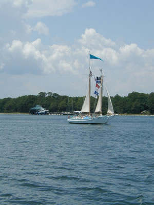 While sailing north into Pensacola Bay, we notice a Navy vessel holding its position in the middle of the Bay. As we get closer and watch the operation, it is clear that Navy helicopter pilots are practicing landings and take offs from the vessel.