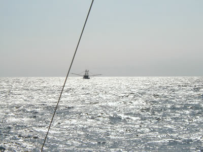 The vessel is predictably named Bay Lander. All day a procession of several helicopters fly in a big circle, taking turns landing and taking off with the aid of a ground crew on the vessel's deck. We didn't want to get too close, what with Homeland Security and all that.